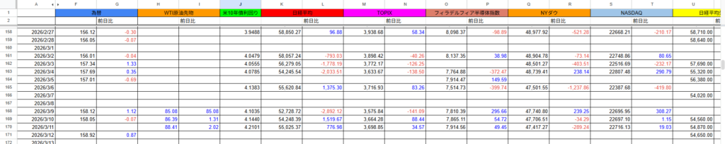 中東情勢はまず原油価格を動かし、それが夜通し世界を駆け巡って翌朝の日本市場を叩く。この連動を痛感した私は、毎日記録しているスプレッドシートに、新しく「WTI原油先物」の欄を追加しました。
