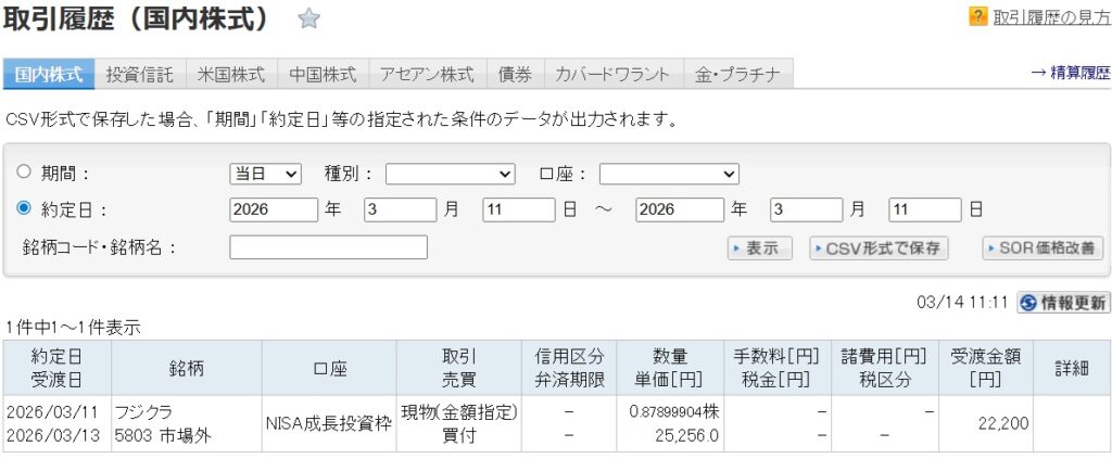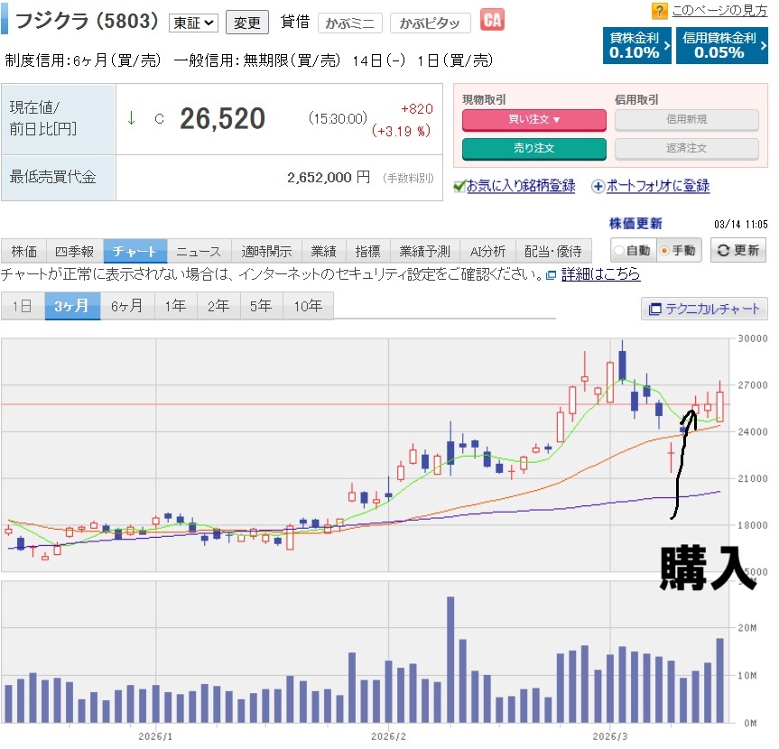 3月10日、市場は大きく反発しました。翌3月11日、私は仕事の帰り道に「半値戻しは全値戻し」という株格言を聞き、新たな一歩を踏み出しました。 ずっとウォッチしていたフジクラ(5803)を、22,200円分購入したのです。